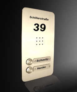 Der Artikel beinhaltet optional auch eine rückseitige Universalbefestigung, welche die Befestigung von nahezu allen Mikrofon/Lautsprechereinheiten – wie z.B.Siedle und vielen anderen erlaubt. Natürlich haben wir nicht für jedes Sprechmodul auf dem Markt eine passende Sonderlösung der Befestigung anzubieten, aber wir haben ein System, bei dem die meisten handelsüblichen Lautsprechereinheiten auf die Platte montiert werden können. Unser genormtes Einbaumaß liegt bei einer Breite bis maximal 75 mm für die Lautsprechereinheit. Für Lautsprechereinheiten, die breiter als 75 mm sind, ist jedoch eine Veränderung der Befestigung notwendig, welche wir gerne als Sonderanfertigung ohne Mehrpreis vornehmen, wenn Sie dies bei Kauf bzw. vor dem Versand der Ware mit uns absprechen . Bitte geben Sie uns dazu bei Auftragserteilung die genauen Maße Ihrer vorhandenen alten oder auch neuen Sprecheinheit an, damit wir die benötigte größere Befestigungseinheit dann entsprechend anbringen können. Fragen Sie ggf. Ihren Elektriker. Wenn unser Serienteil nicht passt, versuchen wir, es passend zu machen. Der Versand ist versichert. Die Preise verstehen sich inclusive Mehrwertsteuer zuzüglich Versand- und Versicherungskosten. Sie erhalten mit der Lieferung eine Rechnung. Mit dem Kauf dieses Produktes erwerben Sie ein exclusives deutsches Markenprodukt, 100 % Made in Germany, das nicht nur oberflächlich, sondern auch an den Kanten mit viel Sorgfalt zum Detail bearbeitet wurde.